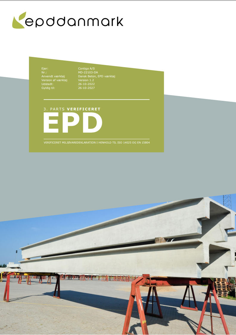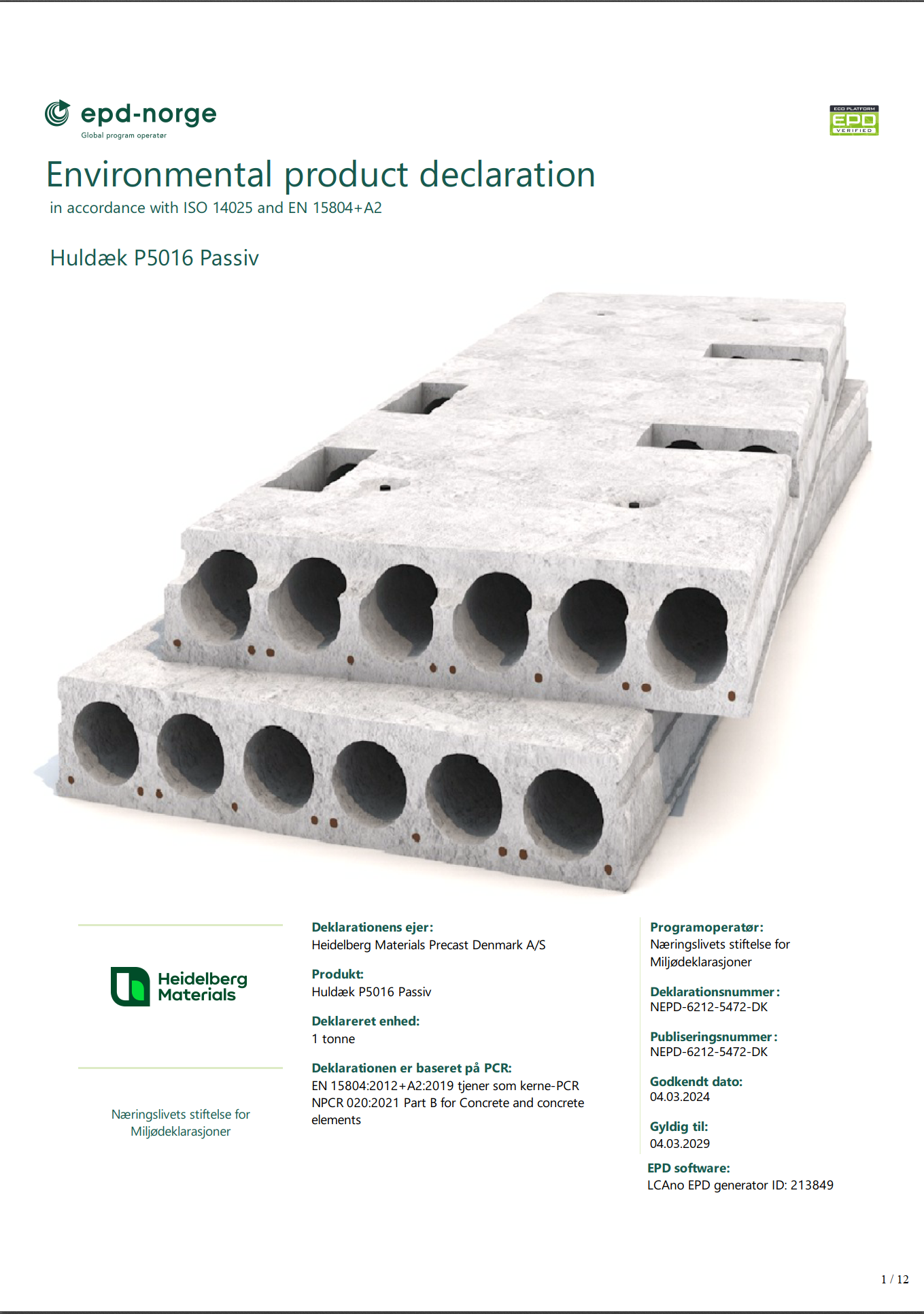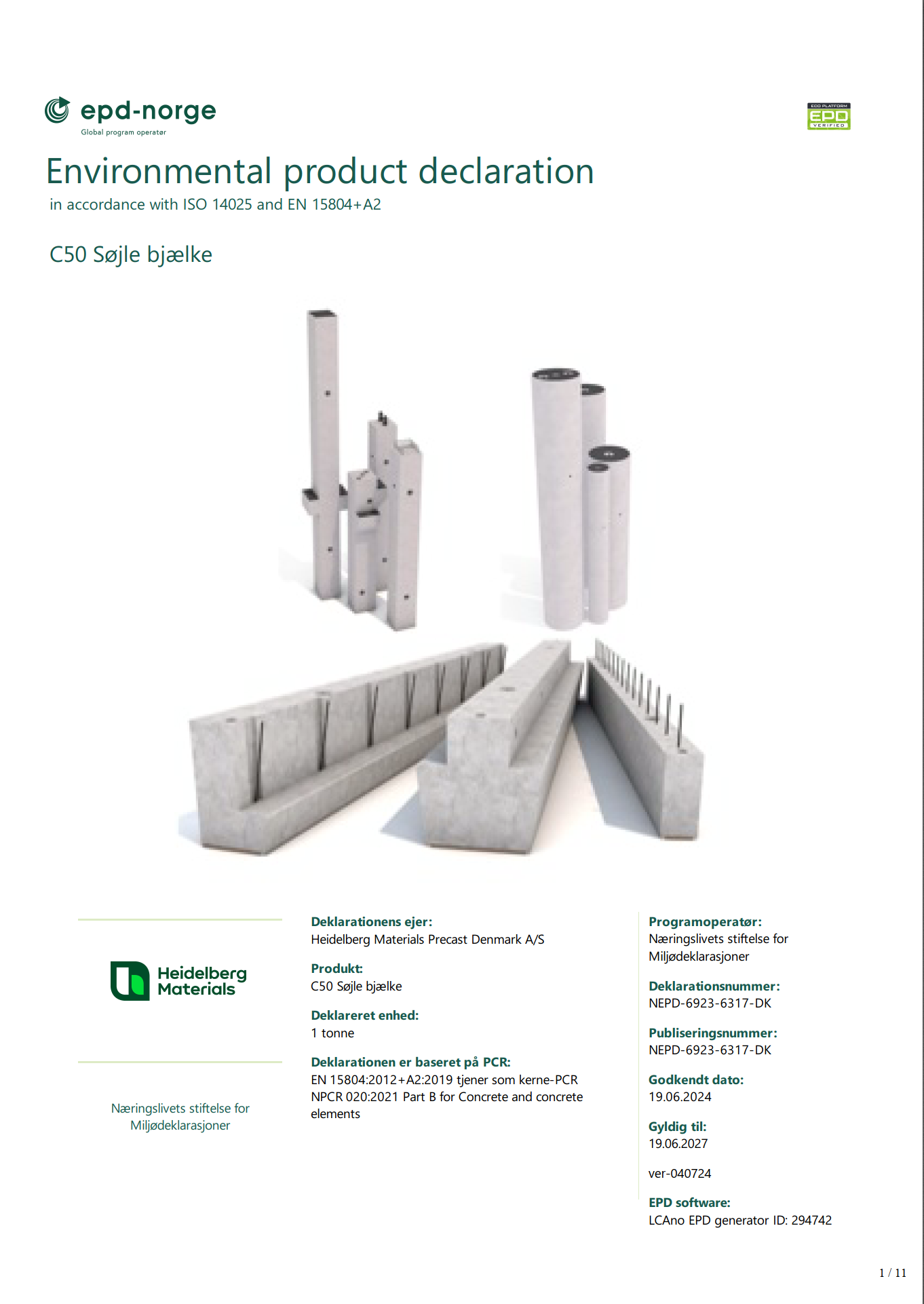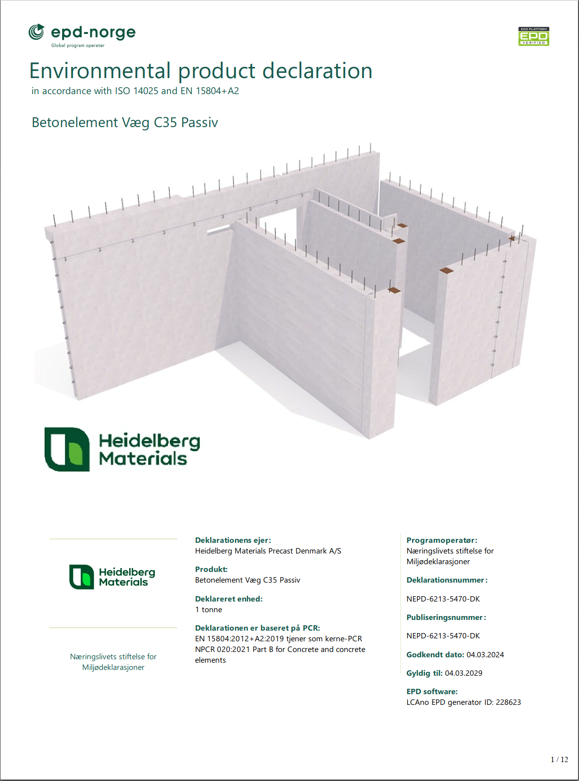 Dansk Beton, som Heidelberg Materials Precast Denmark er del af, har udarbejdet en række branche EPD'er, som er en verificeret dokumentation af betonelementers miljømæssige egenskaber. Branche EPD'erne giver samtidig et overblik over C02-udledningen fra forskellige betonvarianter i markedet.